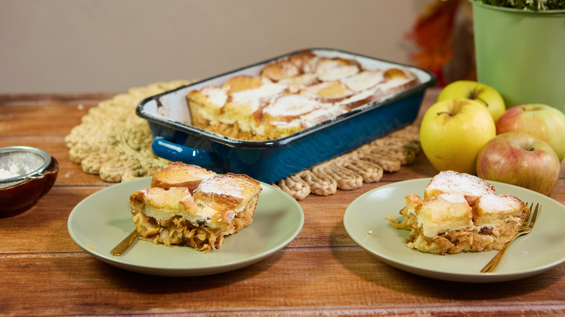 - Jako druhou vrstvu přidejte jablka a zasypte je spařenými rozinkami. Na ně pak navrstvěte opět plátky žemlí.