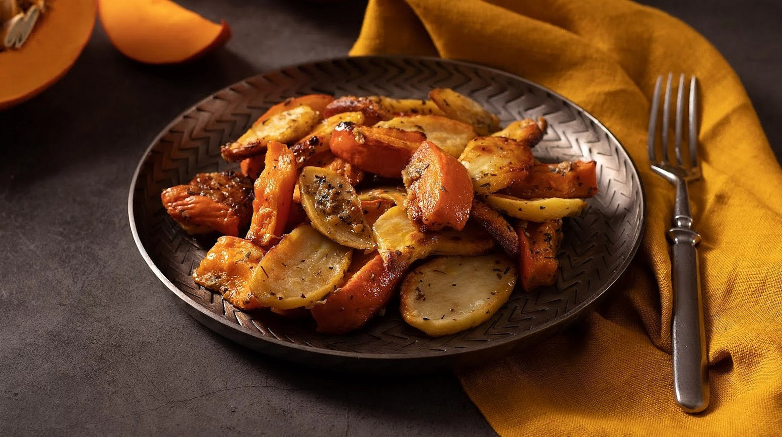 Na 6 porcí budete potřebovat 1 střední dýni hokaido, 6 brambor, 4 stroužky česneku, 5 lžic olivového oleje, 1 lžičku soli a podle chuti mletý pepř, rozmarýn, tymián nebo provensálské bylinky. Pokrm lze také v závěru přípravy doplnit o sýr.