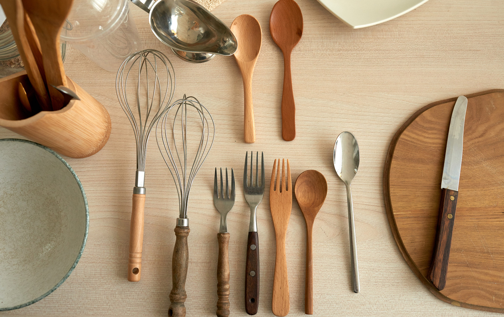 - Kuchyňské náčiní je vyrobeno z plastu, silikonu a kovu. Potřebujeme dřevěná prkénka, váleček na těsto, vál, vařečky, metly, stěrky a mašlovačky.
