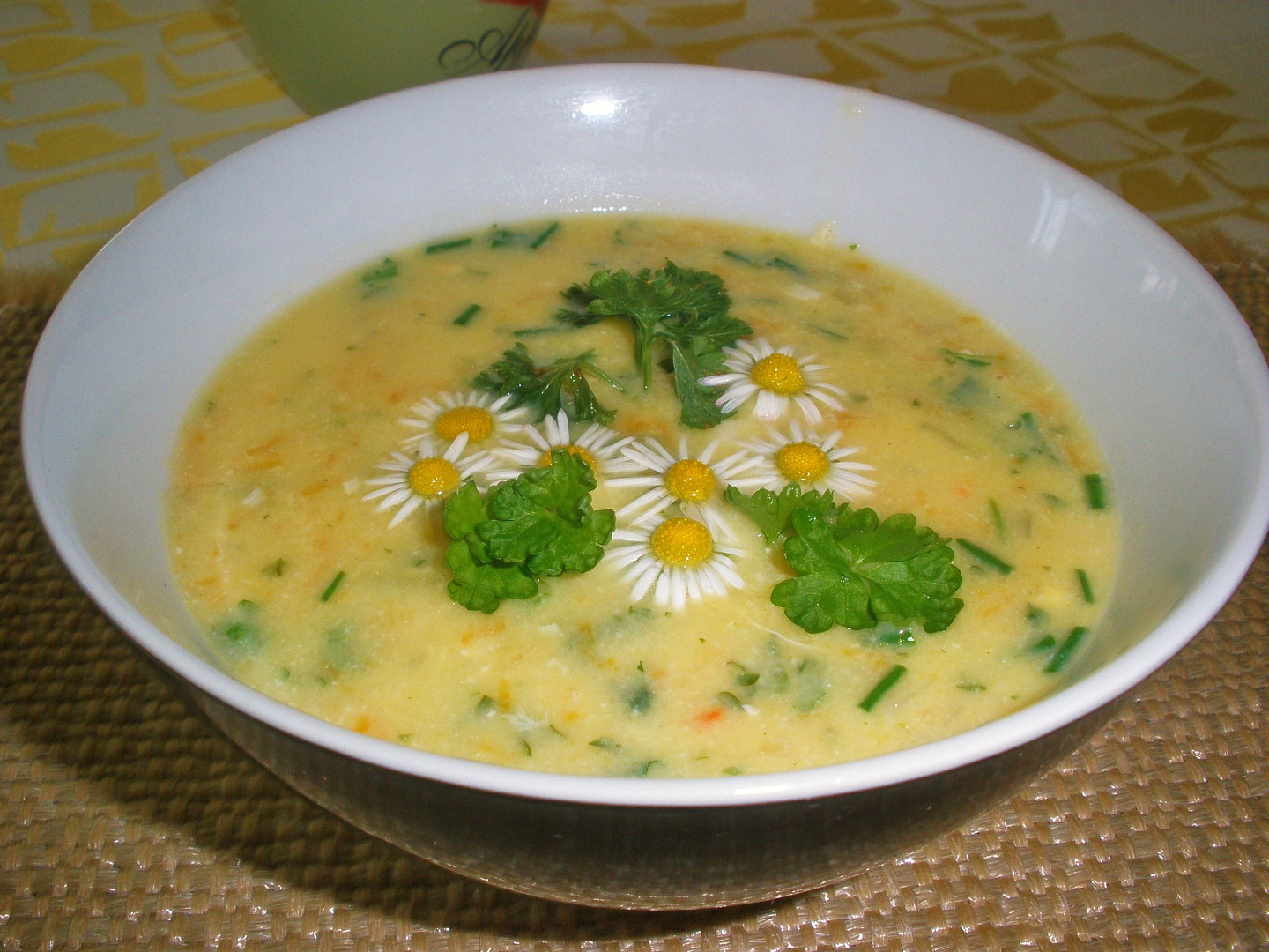 - Na talíři ji můžete ozdobit sekanými zelenými bylinkami a jedlými květy.