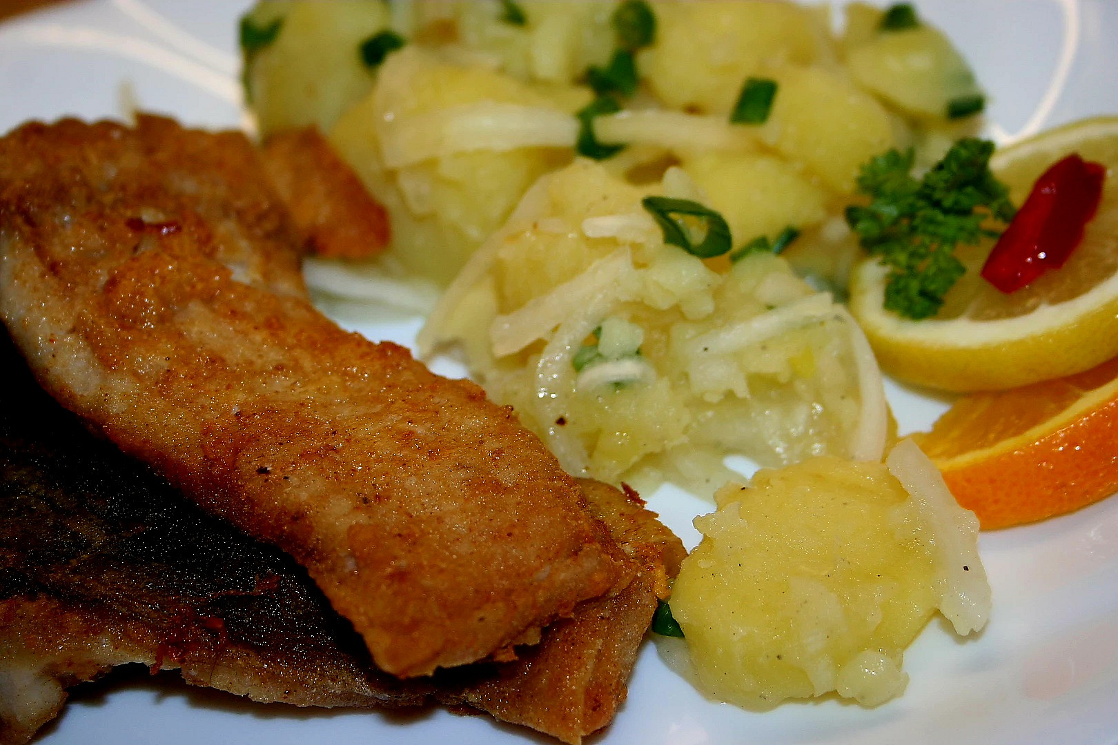 Kapra můžete podávat tradičně s bramborovým salátem, nebo s vařenými či pečenými bramborami.