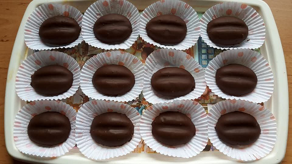 Kávová zrna necháme ztuhnout v lednici. Pak je všechna postupně namočíme do rozpuštěné čokolády a odložíme na pečicí papír.