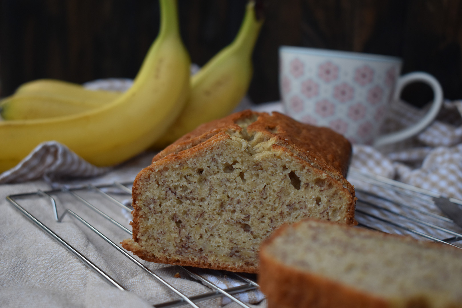 Jemný a vláčný banánový chlebíček s typickou barvou si nás naprosto získal. Když jsou banány v akci, je to skvělá příležitost tuto dobrotu upéct. Chlebíček chutná k snídani i jako moučník po dobrém jídle. Můžete si ho vzít do práce nebo na výlet. Je výtečný jen tak suchý, ale můžete ho také namazat nebo k němu dát na talířek kopeček zakysané smetany.