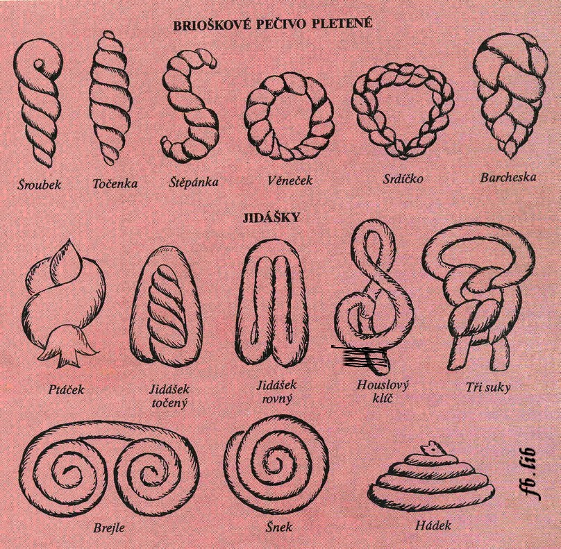 Potřebujete 1 kg mouky (osvědčila se směs hladké a polohrubé), 500 ml mléka (nebo vody),100 g tuku (olej nebo změklý tuk na pečení), 50 g cukru, 2 žloutky (bílky nechte na potírání tvarů), kostku (42 g) čerstvého droždí, špetku soli. Těsto můžete ovonět citronovou kůrou, ale voní i tak pěkně.