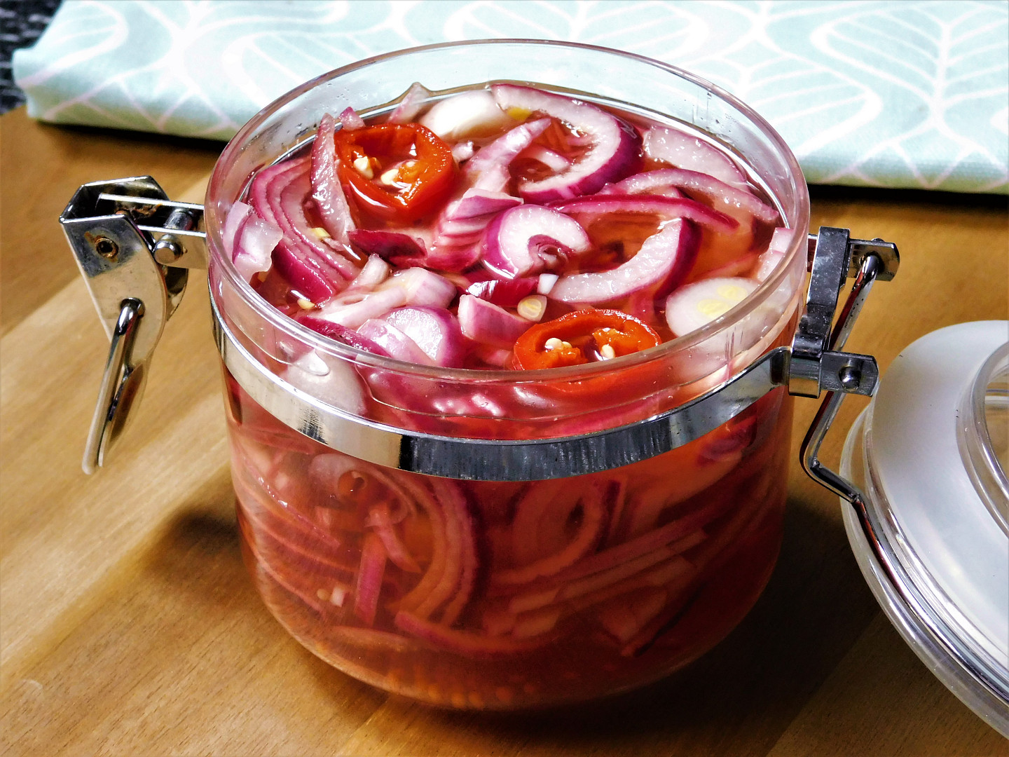Potřebujete 3 střední červené cibule, 125 ml vinného nebo jablečného octa (je jemnější), 250 ml vody, lžíci cukru, lžičku soli, a podle chuti především celý pepř, feferonku, semínka hořčice a případně i stroužek česneku.