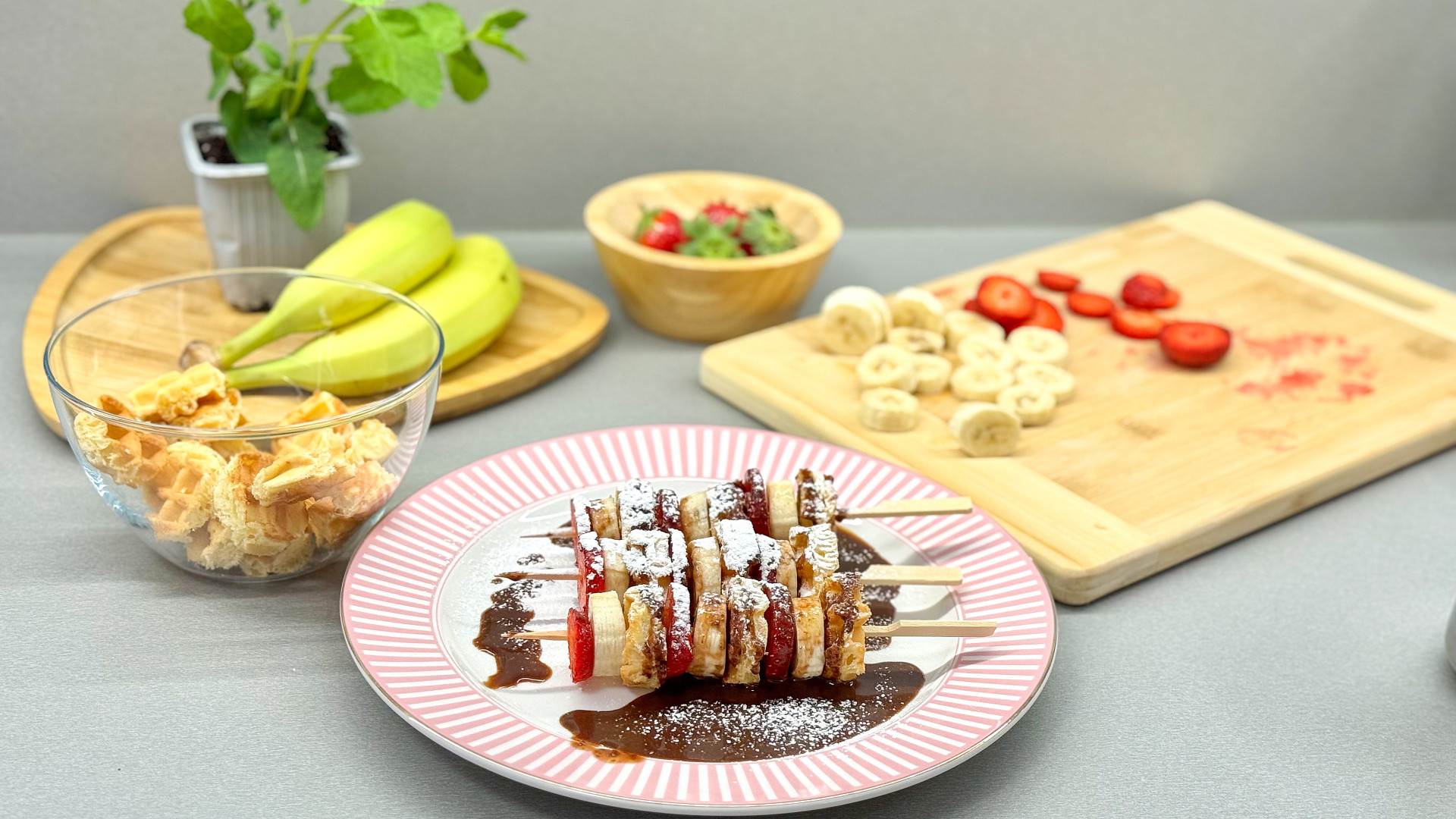 Na dvě porce mini vaflových špízů z úvodního videa budete potřebovat 6 vaflí, dva banány, 1 hrst jahod, 3 lžíce lísko-oříškové pomazánky, cukr moučku na posypání.