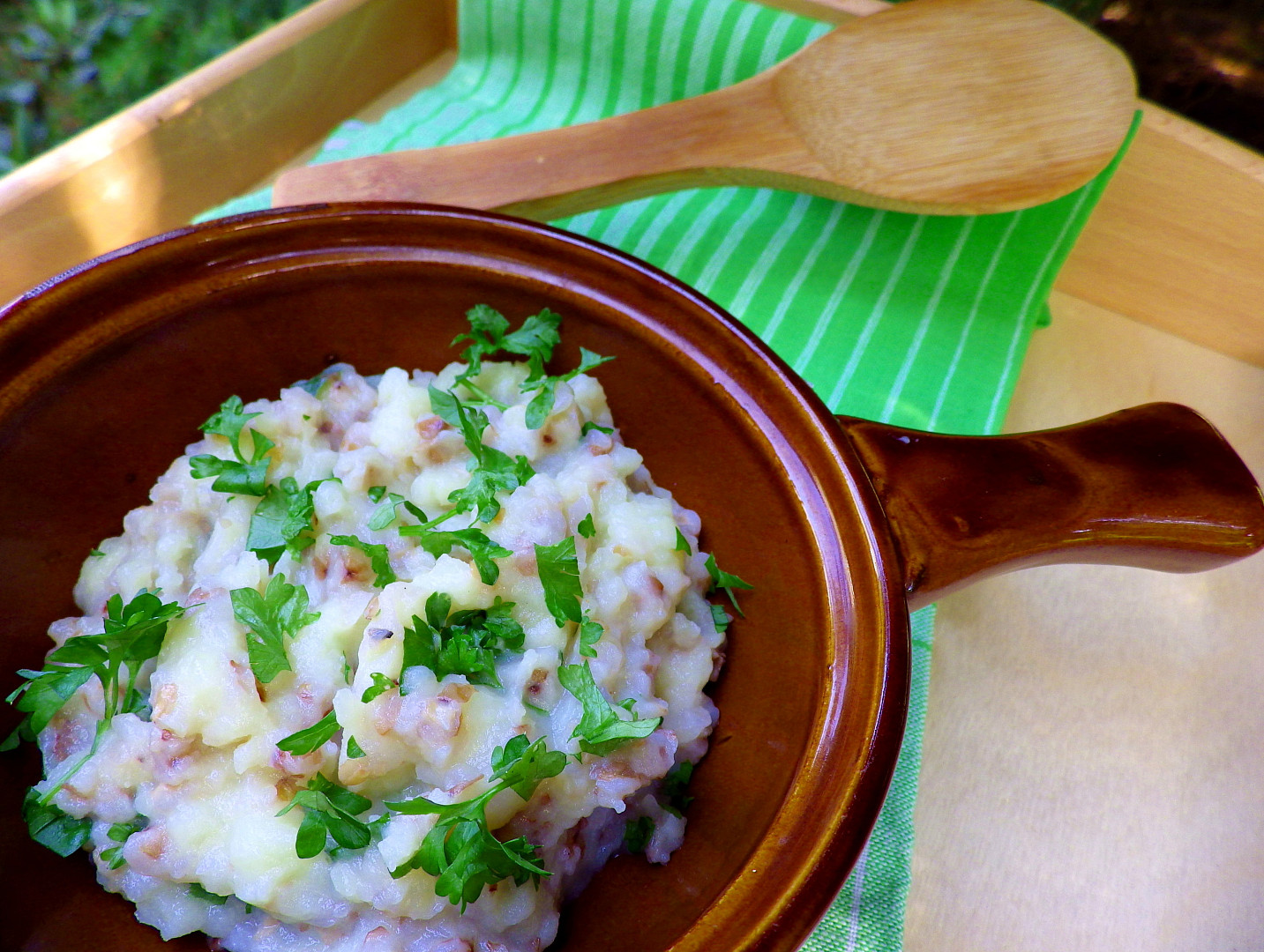 - Vmícháme obilovinu do brambor a ochutíme např. třeným česnekem, bylinkami, tukem z vypečené slaniny, dušenou zeleninou, dušenými houbami - vybíráme podle vlastní chuti a zásob.