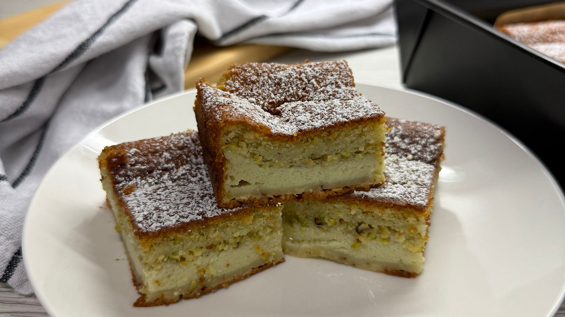 Dvouvrstvá pistáciová buchta z jednoho těsta. Kouzlo uvidíte ve videonávodu