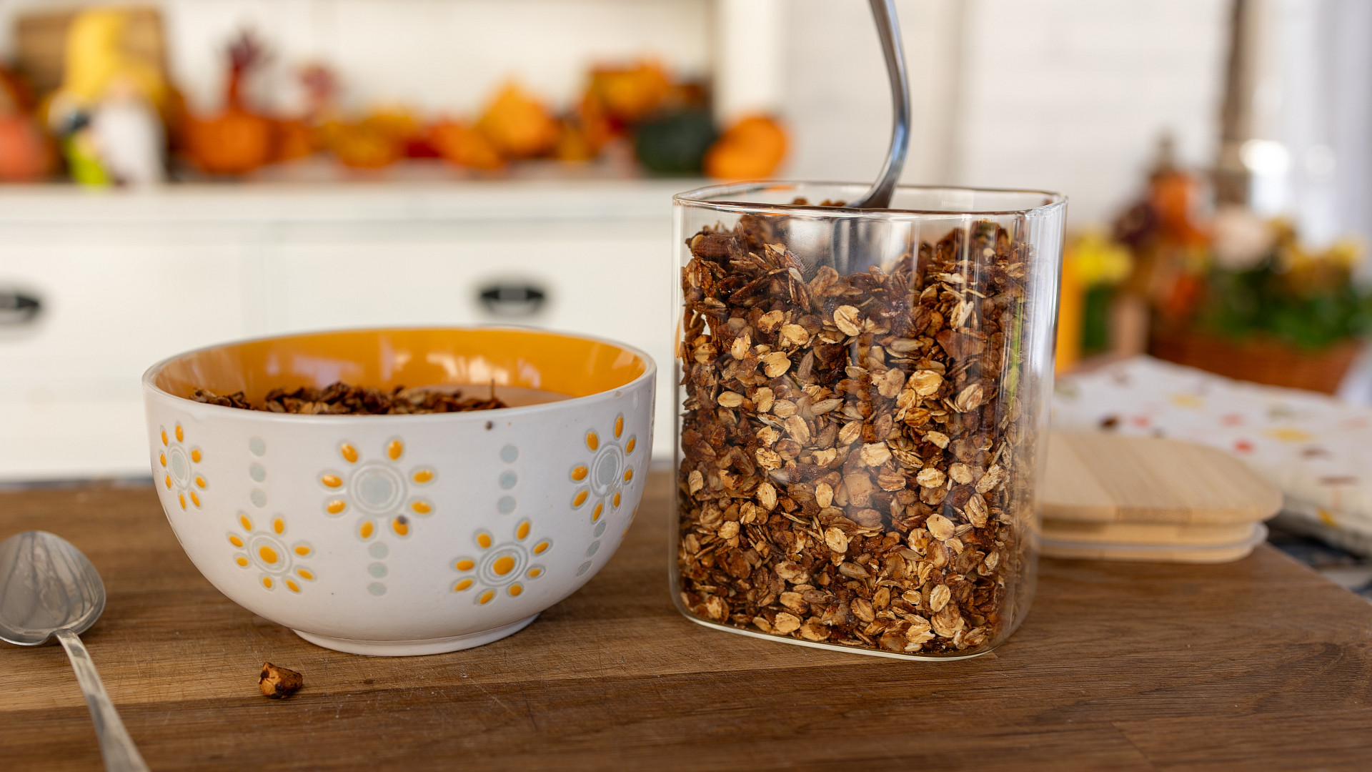 Hotovou granolu nechte vychladnout. Poté ji skladujte na suchém místě, anebo ji rychle zkonzumujte.