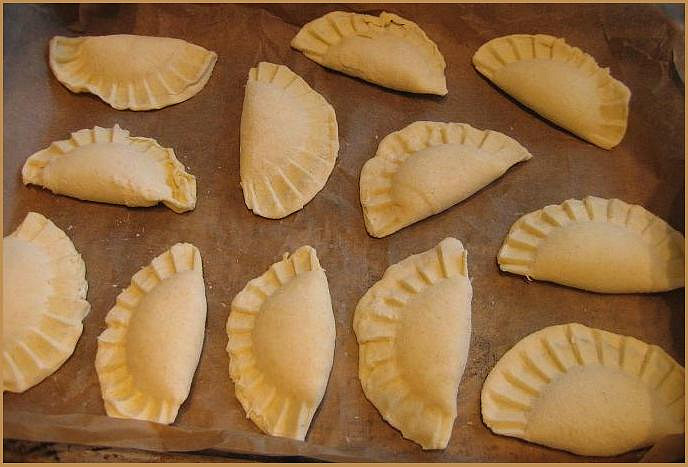 - První způsob je nejjednodušší a nepotřebujete k němu žádné nástroje. Doprostřed kolečka, tedy budoucí taštičky, položte zvolenou náplň, kolečko přehněte napůl a prsty důkladně stlačte okraj těsta.