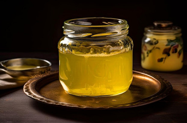 - Hotové přepuštěné máslo slijte přes cedicí plátýnko nebo tenkou látkovou plenu do zavařovacích sklenic. Otevřené sklenice nechte vychladnout a teprve potom uzavřete. Ghí skladujte při pokojové teplotě nebo v lednici.