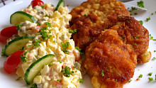 Vepřový řízek usmažený v trojobalu, podávaný s bramborovým salátem Zdroj: Toprecepty
