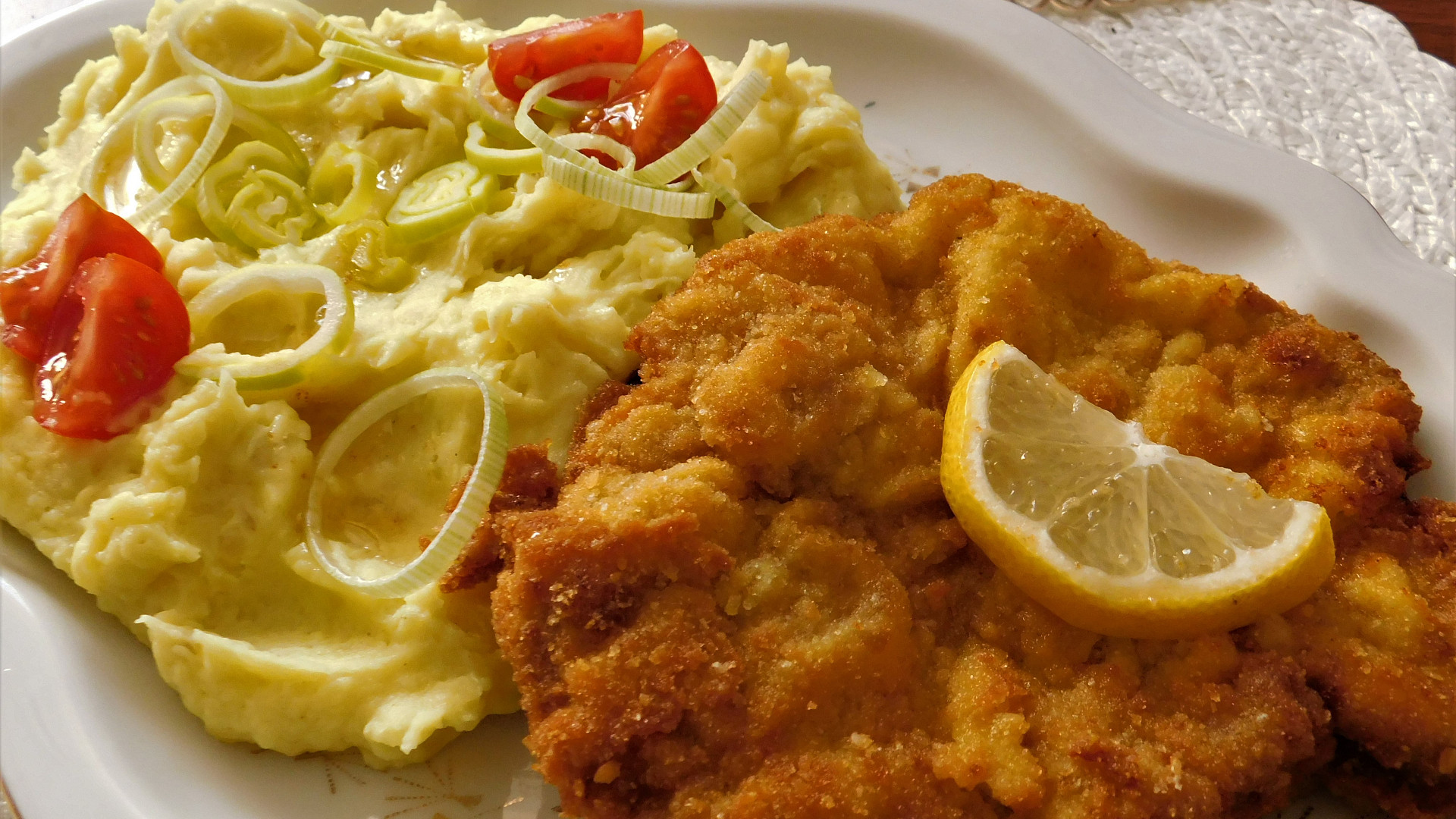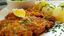 Vídeňský řízek z telecího masa, obalený v trojobalu, podávaný s bramborami Zdroj: Toprecepty