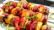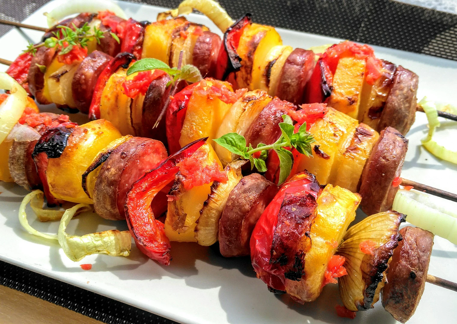 Ostré špízy z brambor, uzeniny, paprik a cibule s pikantním přelivem Zdroj: Toprecepty