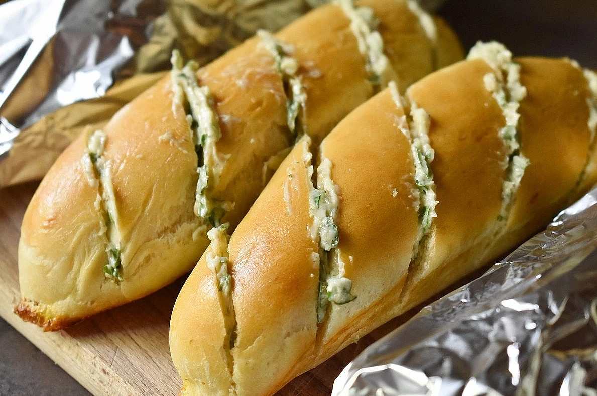 - Pečivo dobře vychlaďte, na povrchu několikrát šikmo nařízněte a do zářezů vetřete bylinkové máslo. Po jednom kousku pak bagetky zabalte do alobalu a uložte do mrazáku. Pozor, do mrazáku vkládejte jen zcela vychladlé bagetky.