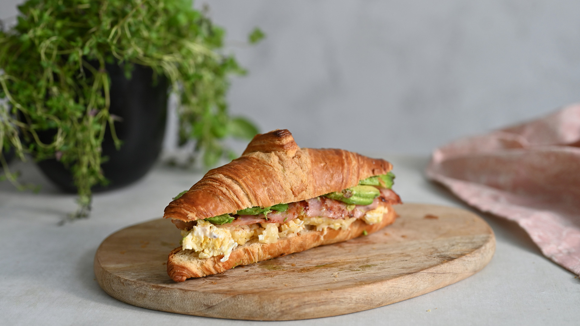 - Nyní začněte vrstvit připravené suroviny. Polovinu croissantu potřete bylinkovým dipem, přidejte míchaná vajíčka, opečené plátky slaniny, plátky avokáda, opět polijte dipem a přiložte druhou polovinu croissantu.