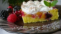 Tento lahodný letní koláč z piškotového těsta posypeme spoustou nadrobno nakrájeného ovoce, včetně rybízu, a po předpečení dozdobíme sněhem z bílku a citrónu. Během chvíle se po něm zapráší.