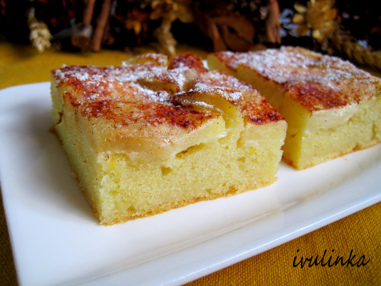 - Po vychladnutí ještě povrch moučníku poprašte práškovým cukrem.