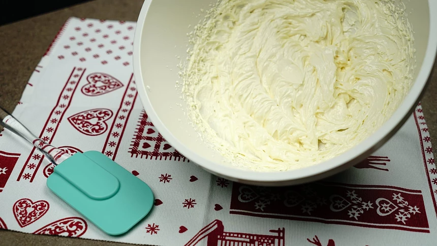 - Změklé máslo v pokojové teplotě šleháme s prosátým moučkovým cukrem (množství cukru podle chuti) do pěny, a do něj po lžících přidáváme vaječnou směs také v pokojové teplotě. Vyšleháme na hladký krém.