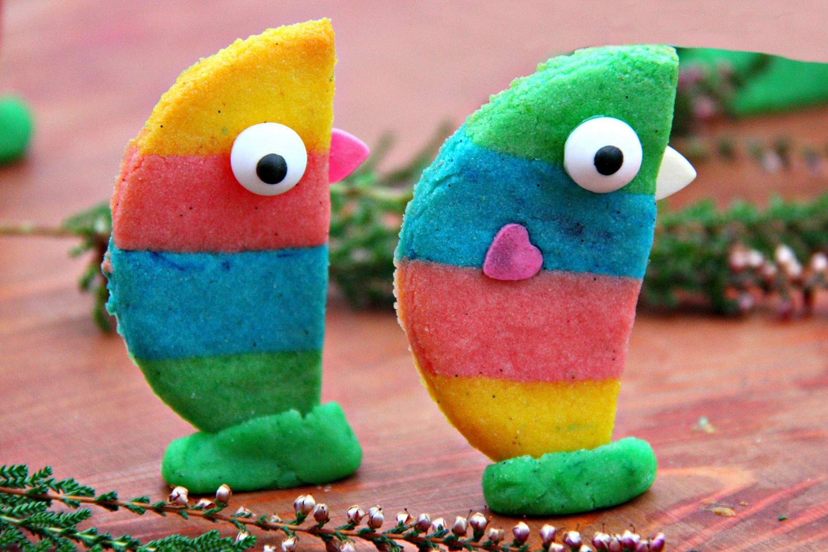 Potřebujeme: 300 g hladké mouky, 200 g másla, 100 g moučkového cukru, 1 žloutek a jedlé potravinářské barvy.