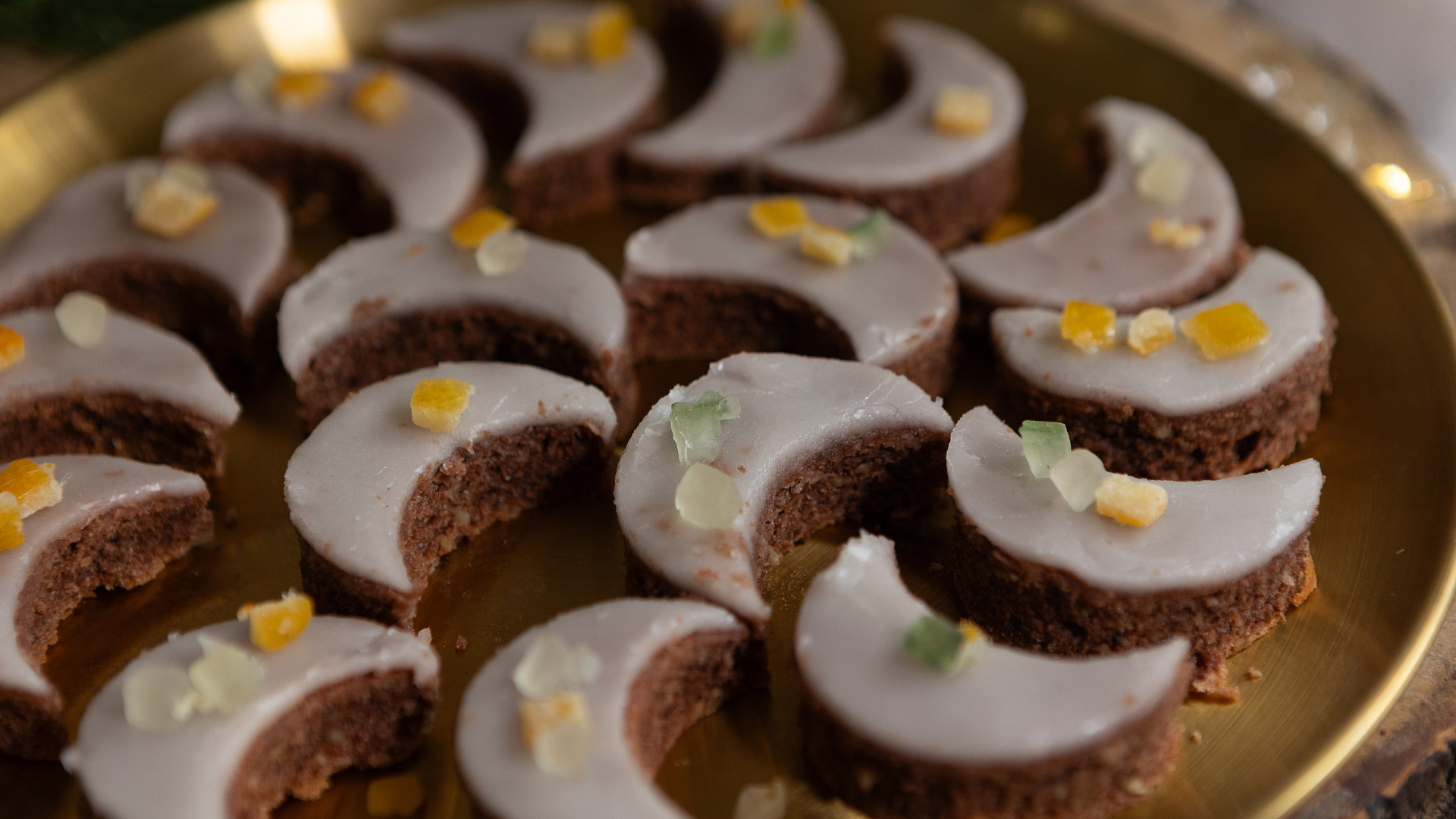 - Nechte asi 15 minut stát, aby poleva částečně ztuhla, a pak začněte vykrajovat kovovým kolečkem měsíčky. Pracujte rychle, aby příliš ztuhlá poleva nezačala při vykrajování praskat. V úvodním videu se podívejte, jak přesně postupovat.
