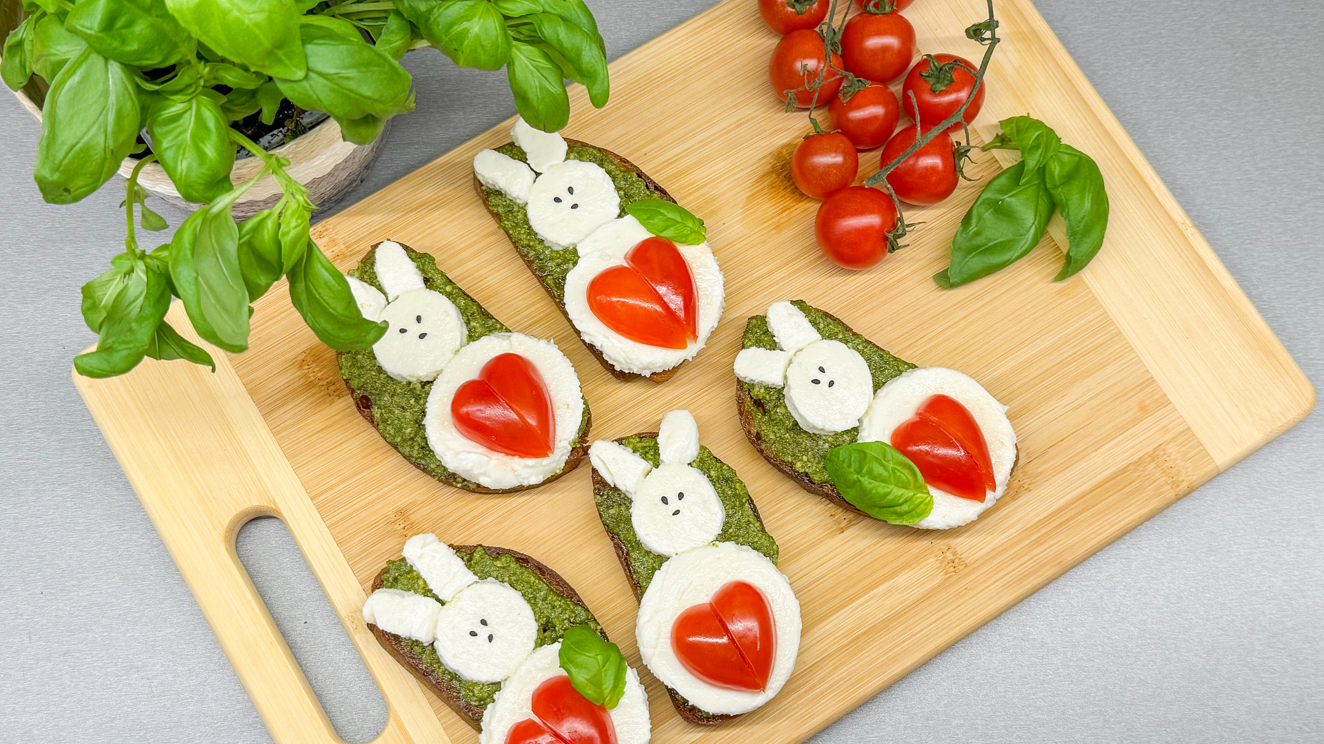 Kombinace rajčat s mozzarellou a bazalkou je barevně velmi atraktivní. Zkuste tentokrát tyto barvy využít pro dětské veselé motivy. Vytvořit jednoduché zajíčky je velmi snadné, a přitom opravdu efektní. Pod motiv můžete dát topinky. Upečte je nasucho nebo usmažte na pánvi, to už není podstatné. Když připravíte jako zelený podklad pod zajíčky pesto, celkový výsledek bude perfektní.