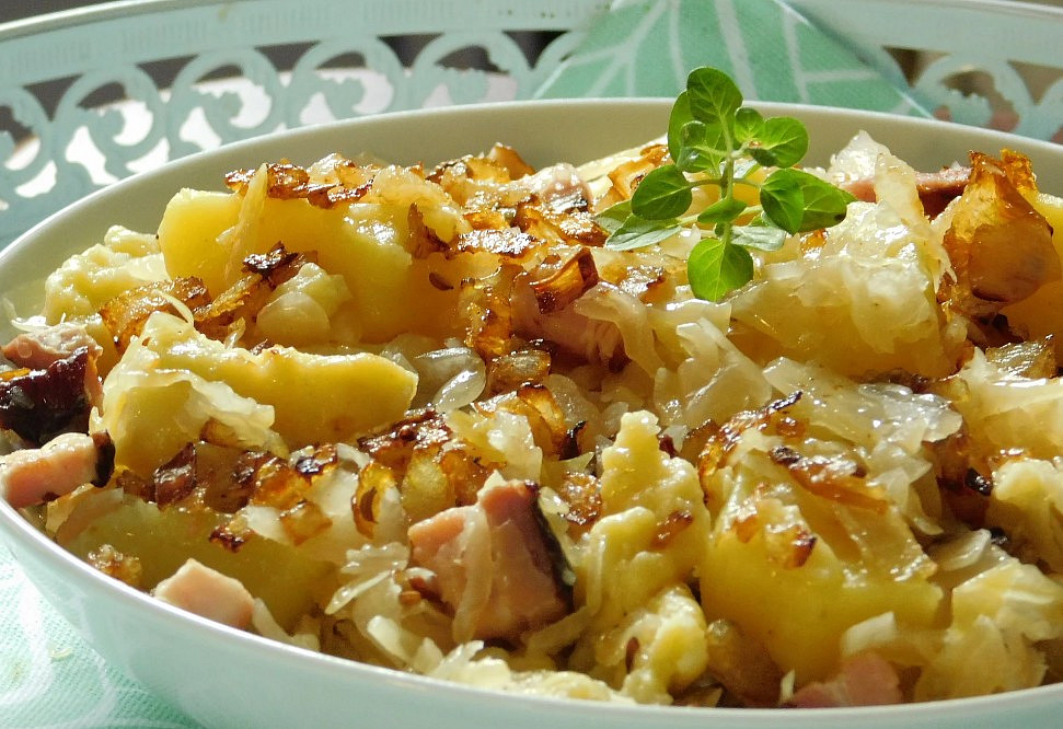 - Brambory sceďte, promíchejte s uvařenými kroupami, vařeným nebo syrovým kysaným zelím a pokrájeným vařeným uzeným masem či rozškvařenou slaninou.
