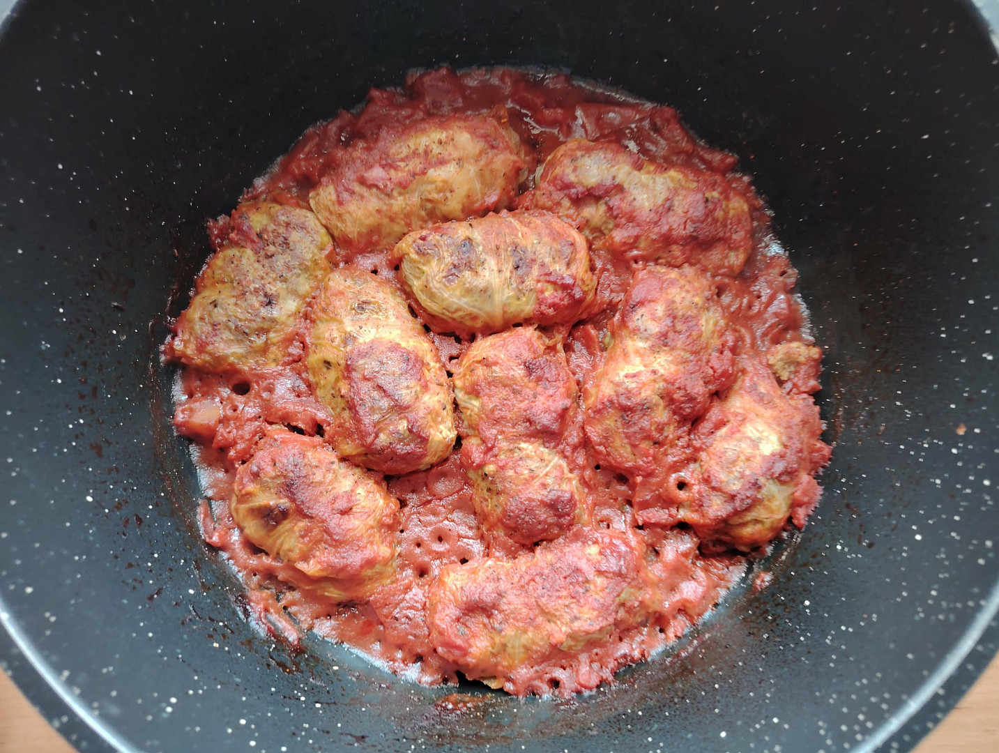 Remosku vymažeme sádlem a vysypeme kostičkami slaniny a cibule, popřípadě nahrubo pokrájeným česnekem. Závitky naskládáme jeden vedle druhého. Zalijeme je rajčatovou šťávou, drcenými rajčaty nebo domácím kečupem. Pokud je omáčka hustá, přidáme trochu vývaru. Přiklopíme pečicí víko a pečeme, dokud povrch závitků nezačne tmavnout.