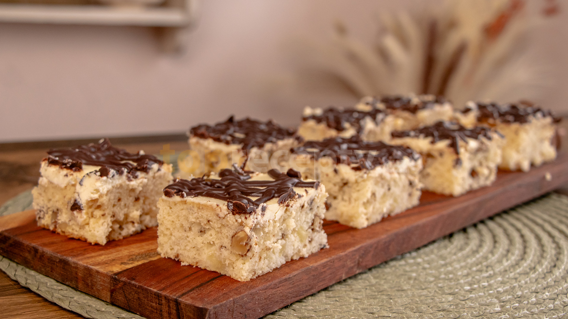 vejce, cukr krupice, mouka polohrubá, kypřící prášek do pečiva, sůl, ořechy sekané, kompot ananasový, máslo, tvaroh ve vaničce, cukr vanilkový, cukr moučkový, čokoláda