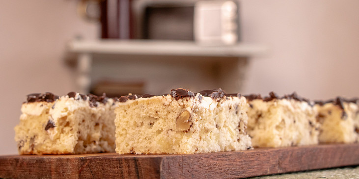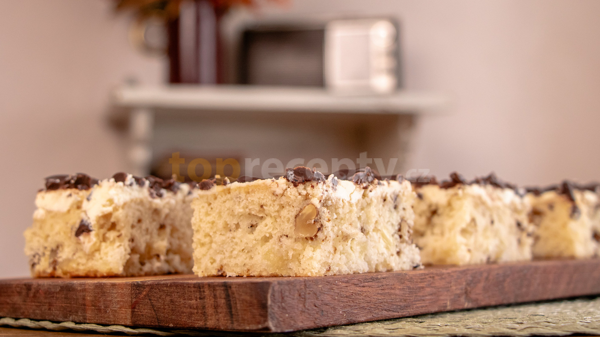 vejce, cukr krupice, mouka polohrubá, kypřící prášek do pečiva, sůl, ořechy sekané, kompot ananasový, máslo, tvaroh ve vaničce, cukr vanilkový, cukr moučkový, čokoláda