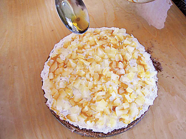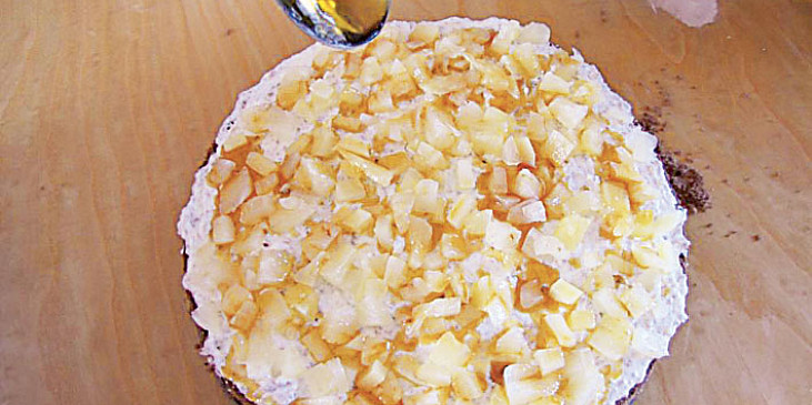 vejce, cukr krupice, mouka polohrubá, voda, olej, kakao, kypřící prášek do pečiva, cukr krupice, smetana ke šlehání, ztužovač šlehačky, cukr vanilkový, smetana zakysaná, ananas, čokoláda, tuk, mouka hrubá