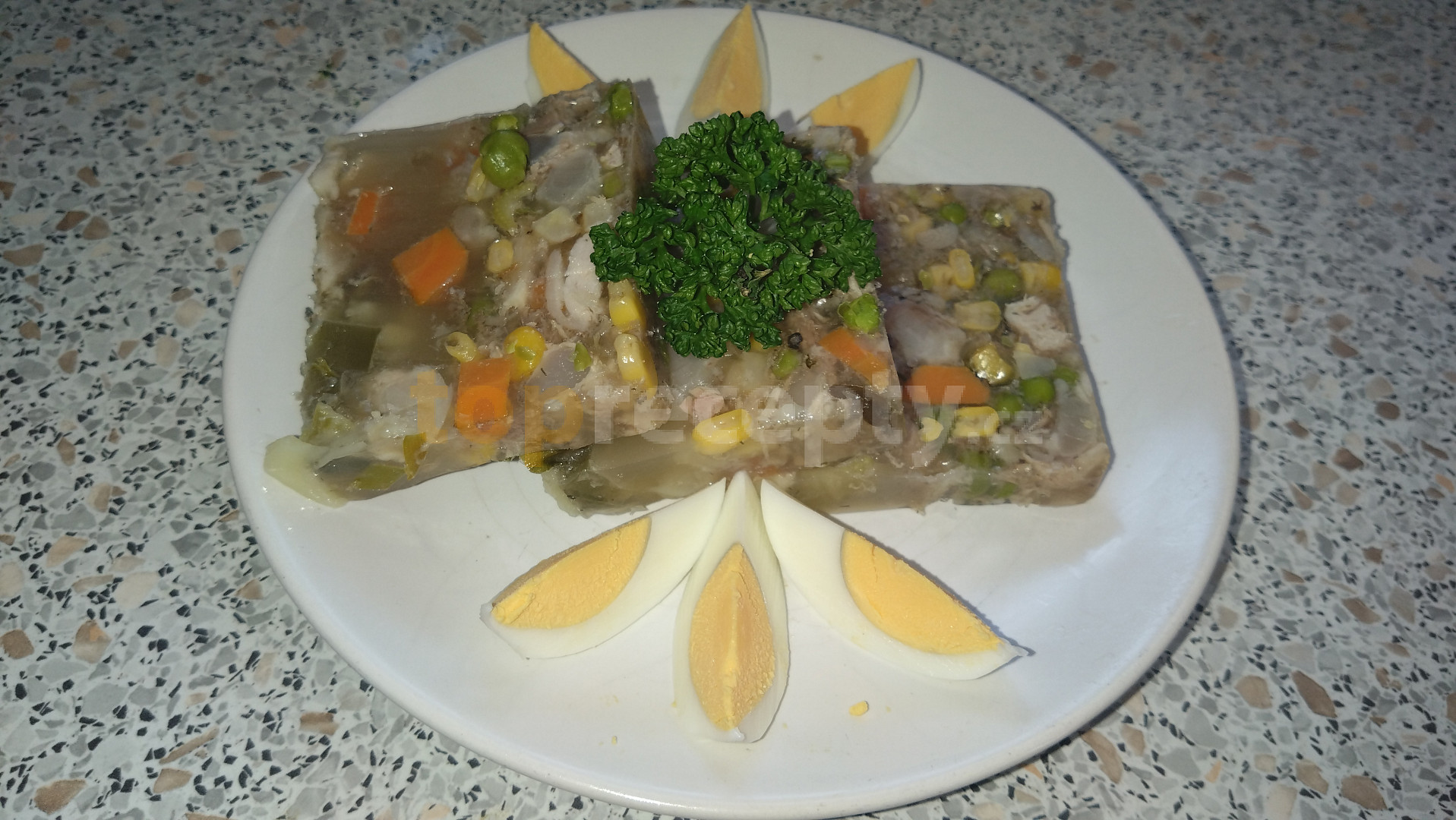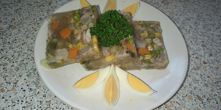 koleno vepřové, nožička vepřová, sůl, bobkový list, koření nové koření, pepř černý, cibule, hrášek mražený, mrkev, celer, ocet, pepř mletý, cibule červená
