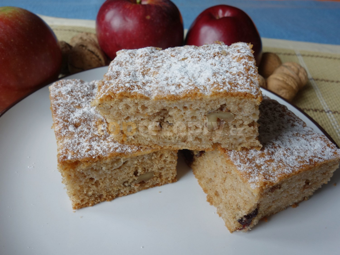 mouka hladká, cukr krupice, olej, vejce, kypřící prášek do pečiva, skořice, jablko, sůl, rozinky, tuk, mouka hrubá, cukr moučkový, poleva citronová