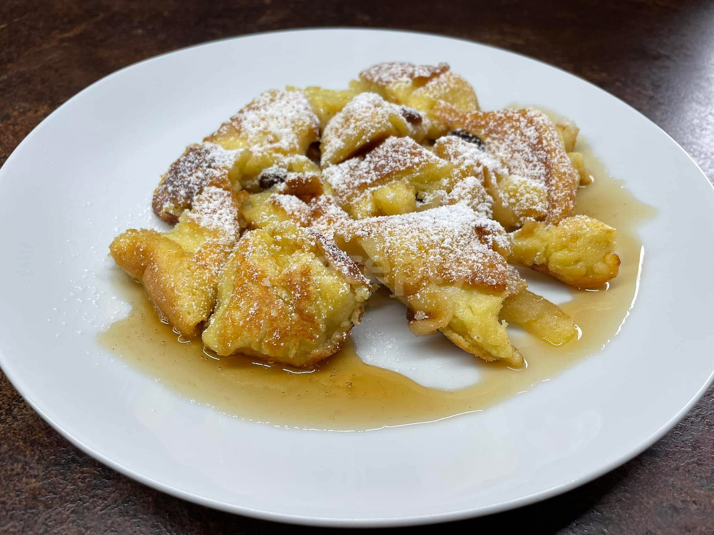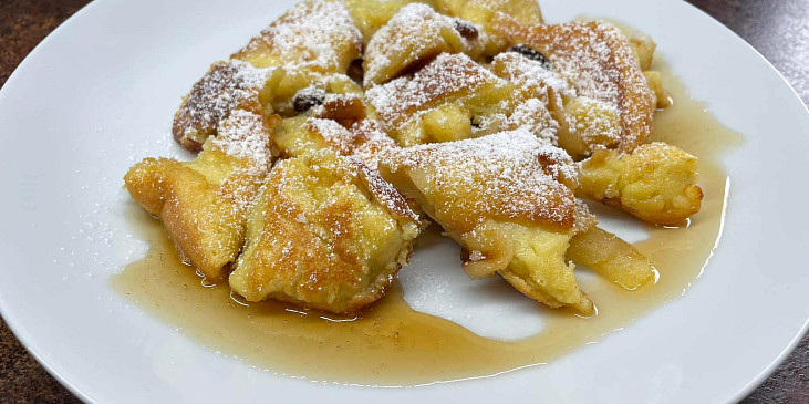 jablko, mouka hladká, mléko, vejce, cukr krystal, cukr vanilkový, sůl, kypřící prášek, rozinky, rum, cukr moučkový, máslo, cukr moučkový, med