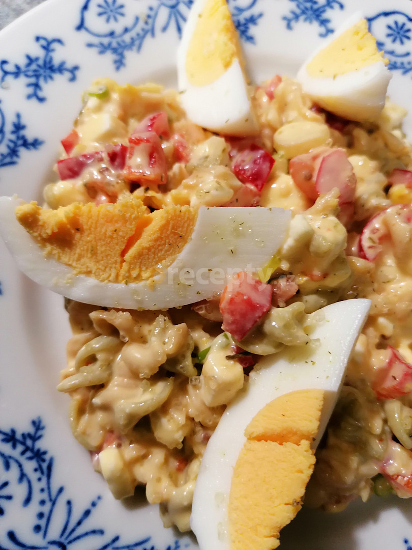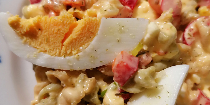 cibule červená, cibulka jarní, rajče cherry, okurka salátová, sýr gouda, smetana zakysaná, hořčice, kopr, sůl, pepř, cukr, vejce