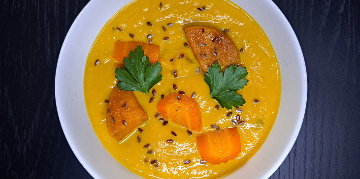 batáty, mrkev, cibule červená, česnek, smetana ke šlehání, vývar zeleninový, olej olivový, římský kmín mletý, sůl, pepř mletý, čerstvé bylinky