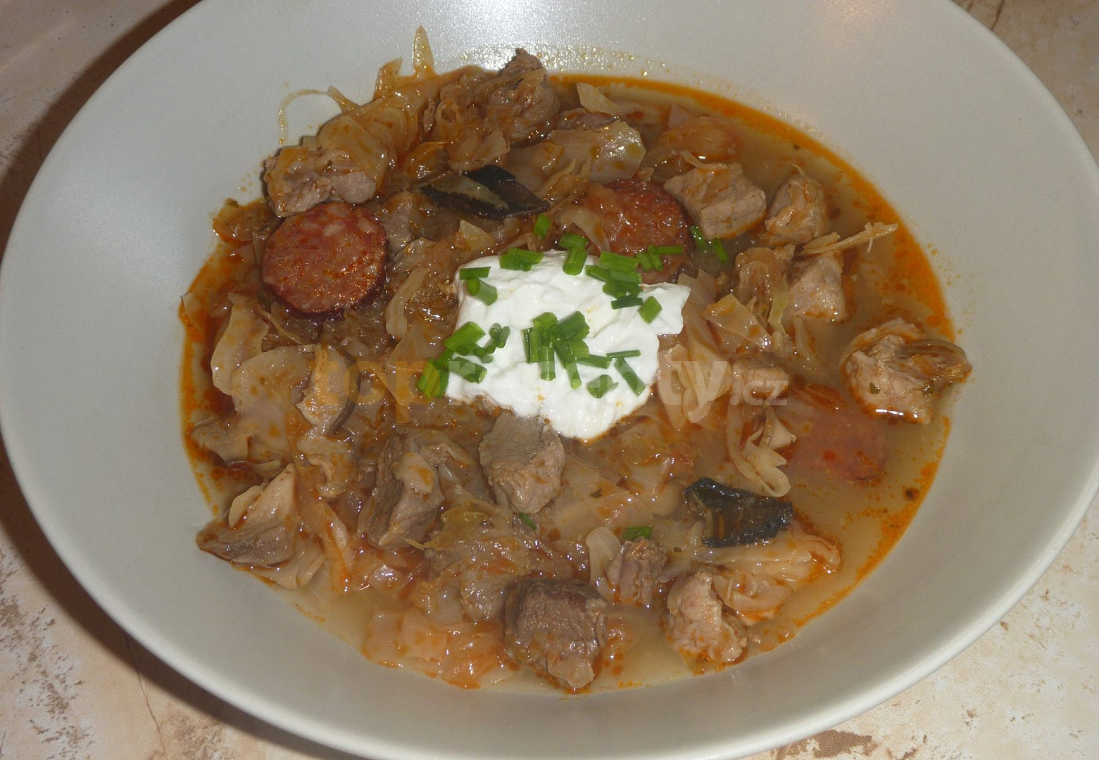 zelí kysané, zelí bílé hlávkové, kosti vepřové, plecko vepřové, klobása, salám měkký, protlak, bobkový list, koření nové koření, sůl, pepř