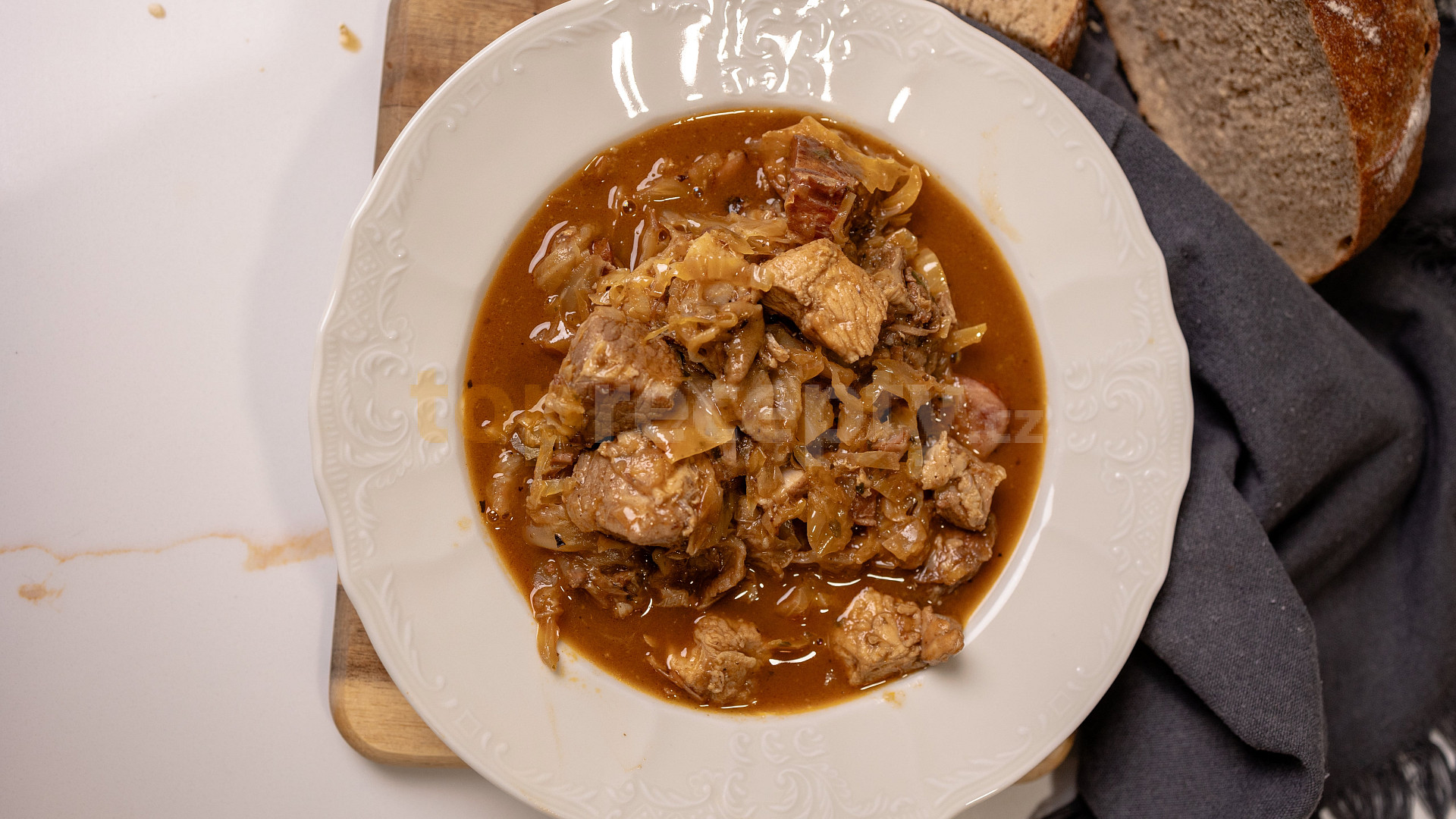 zelí kysané, zelí hlávkové, hovězí zadní, plec vepřová, žebra vepřová, maso drůbeží, bůček uzený, klobása, houby sušené, cibule, slanina anglická, bobkový list, sůl, majoránka sušená, kmín drcený, pepř mletý, paprika sušená sladká, libeček sušený, sádlo