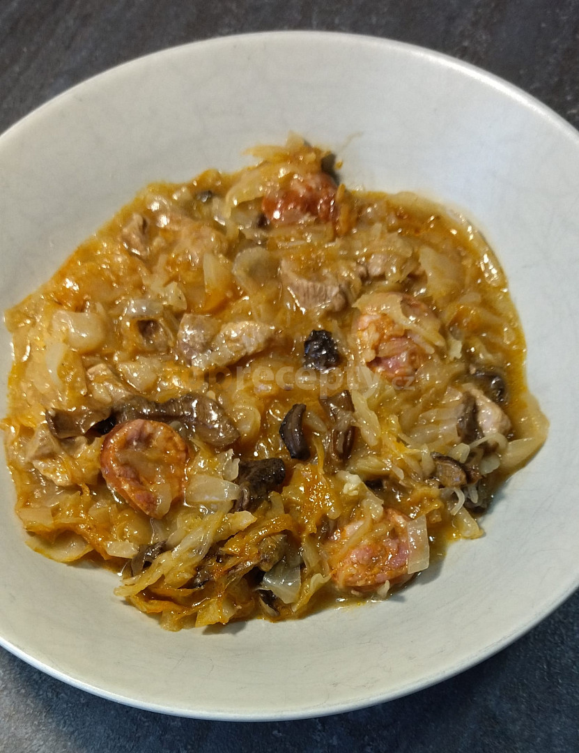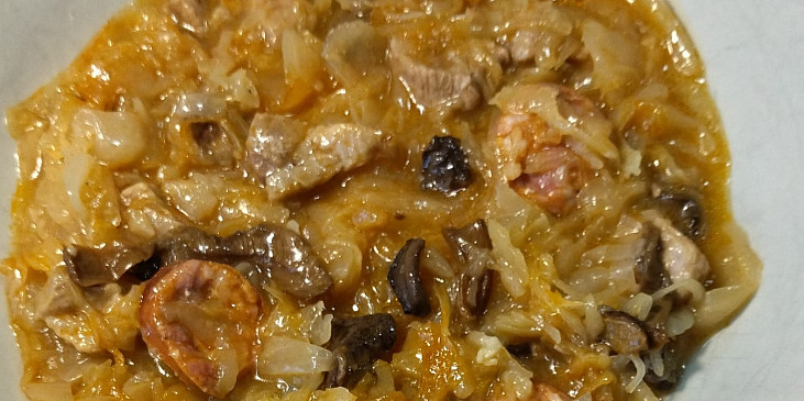 zelí, zelí hlávkové, klobása, maso králičí, skelet kuřecí, kotleta vepřová, houby sušené, cibule, víno červené, sádlo, škvarky, koření, koření oregáno, pepř, kmín drcený, paprika sušená uzená, paprika sušená pálivá