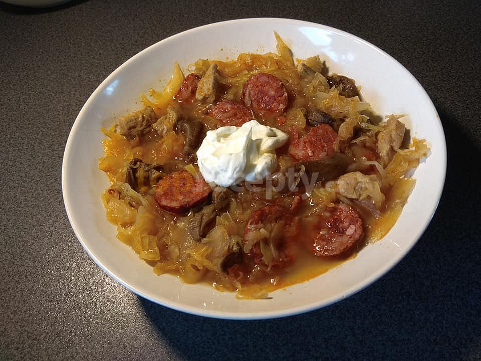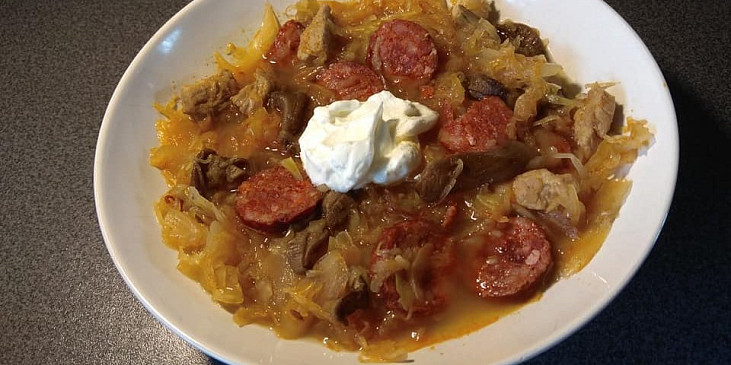 maso vepřové, zelí kysané, koření krkovička, kmín celý, sůl, pepř, paprika sušená sladká, klobása pikantní, česnek