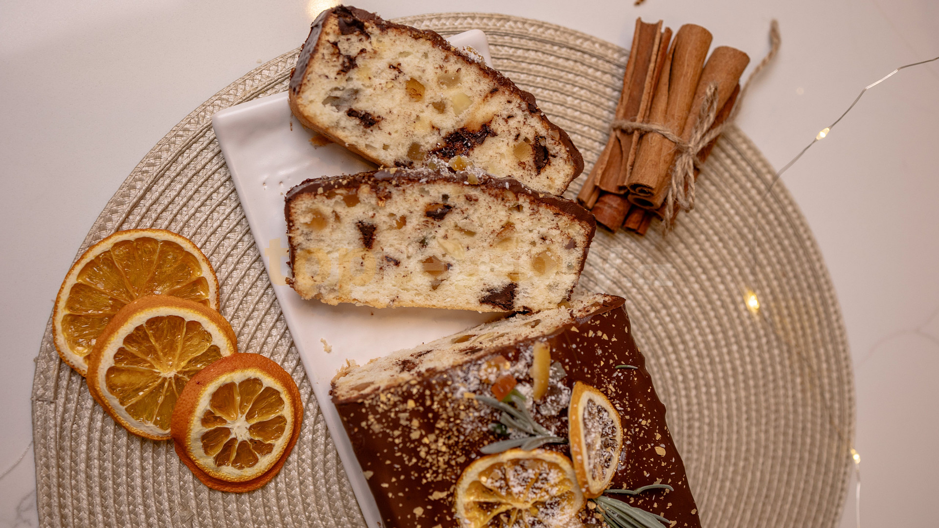 cukr moučkový, mouka hrubá, máslo, bílek, čokoláda, mandle sekané, ovoce kandované, tuk, mouka hrubá, poleva čokoládová