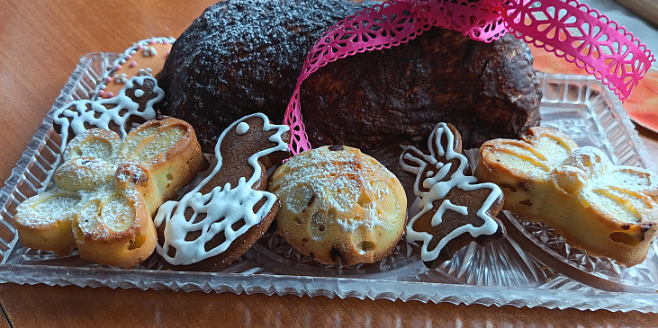 cukr moučkový, máslo, žloutek, ořechy vlašské, rozinky, ovoce kandované, bílek, cukr krupice, mouka hladká, kypřící prášek do pečiva, čokoláda na vaření, rozinky, tuk, mouka hrubá