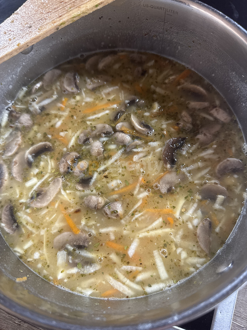 cibule, česnek, brambory, celer, petržel, mrkev, houby čerstvé, vývar zeleninový, mouka hladká, olej, kmín drcený, sůl, pepř mletý, majoránka, čerstvé bylinky, koření polévkové