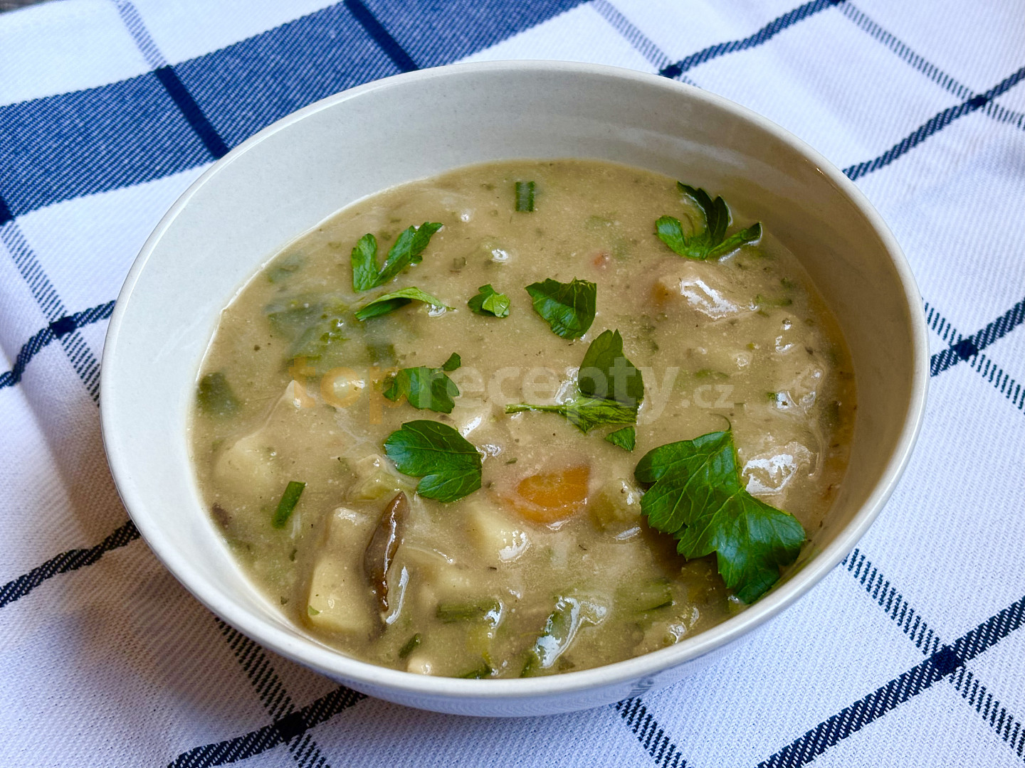 brambory, mrkev, celer, petržel, mouka polohrubá, máslo, cibule, houby sušené, česnek, vývar zeleninový, sůl, pepř mletý, majoránka