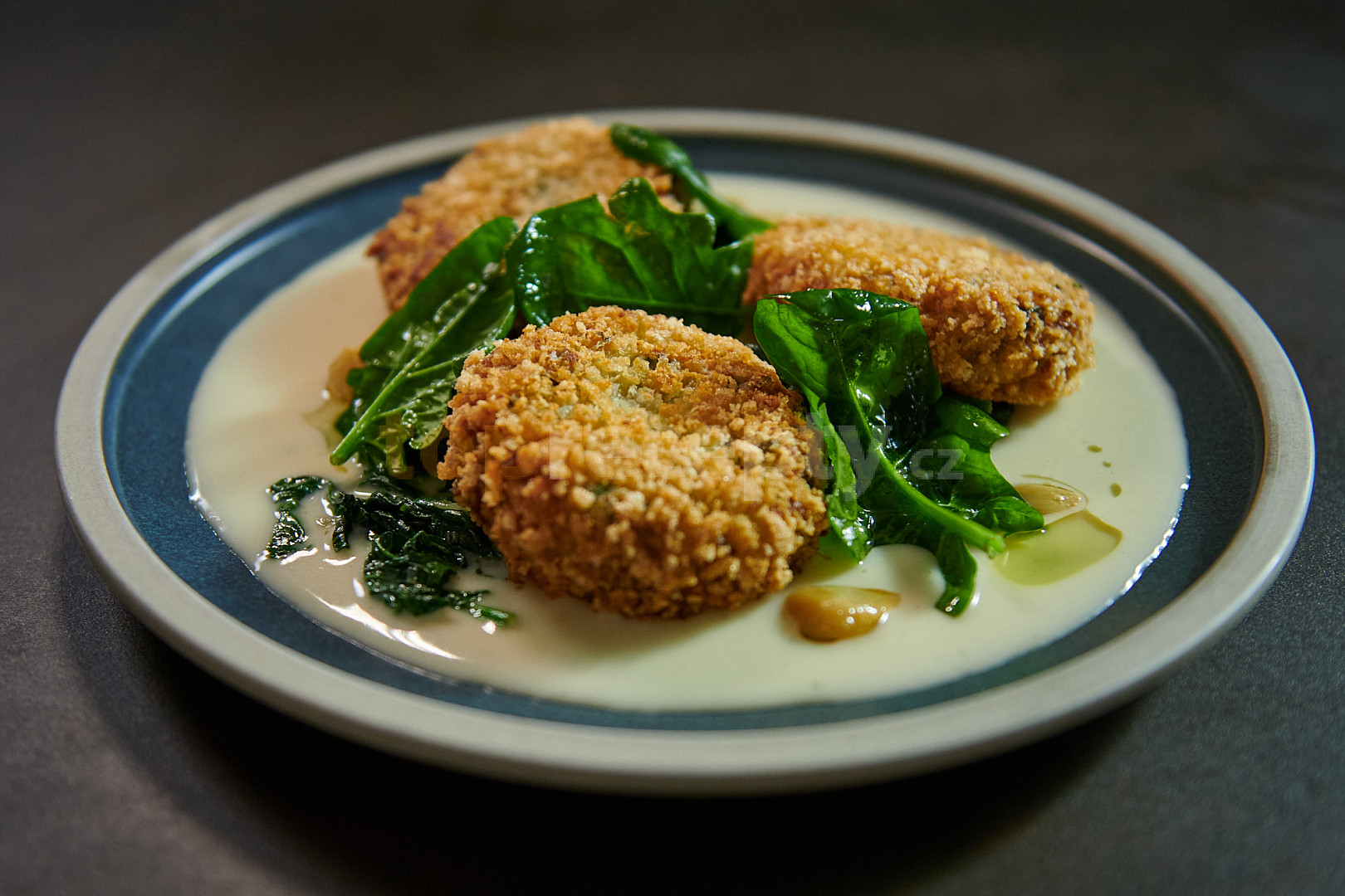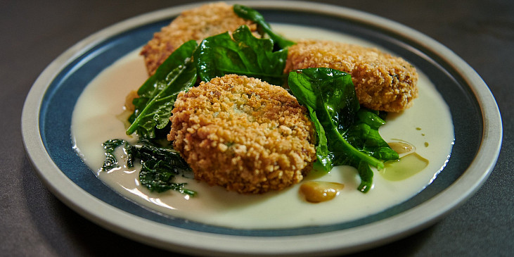 brambory typ c, sýr s modrou plísní, olej slunečnicový, ghee, cibulka jarní, mouka hladká, strouhanka, vejce, nať petrželová, špenát čerstvý, olej olivový, pepř mletý, sůl, vývar zeleninový, bobkový list, cibule šalotka, mouka hladká, tymián čerstvý, máslo, česnek, sůl