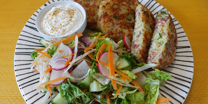brambory, cibule, salám uherský, vejce, sýr tvrdý, pažitka, nať celerová, petrželka, sůl, pepř mletý, mouka hrubá, kypřící prášek do pečiva, olej