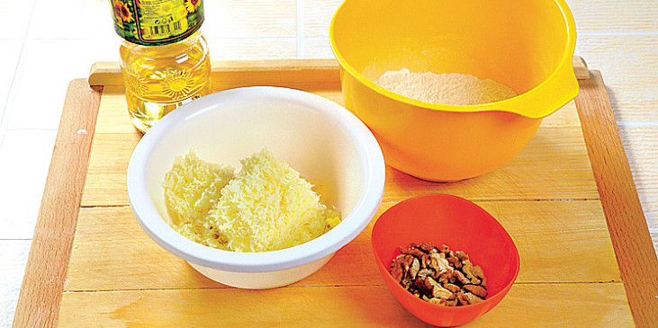 mouka hladká, voda, brambory, cibule červená, ořechy vlašské, droždí čerstvé, olej rostlinný, sůl, cukr krupice, kmín drcený, ocet, mouka hladká