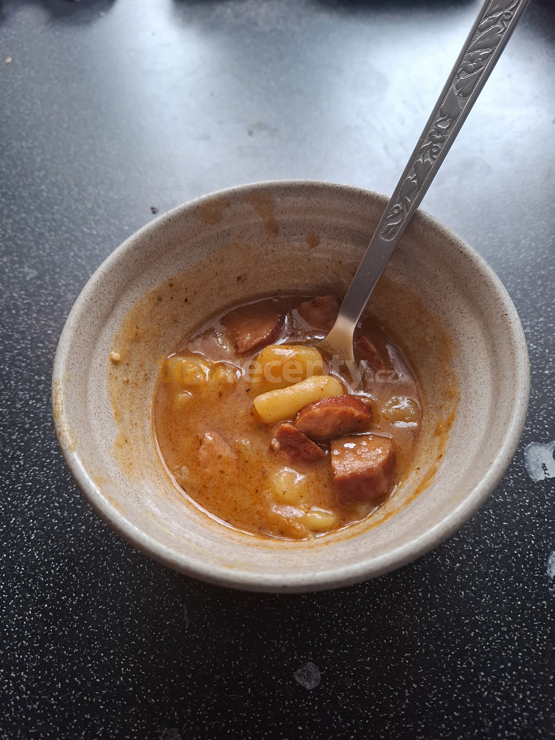 špekáček, brambory, cibule, česnek, majoránka, paprika sušená sladká, paprika sušená pálivá, kmín mletý, vývar hovězí, sůl, pepř, olej, voda, mouka hladká