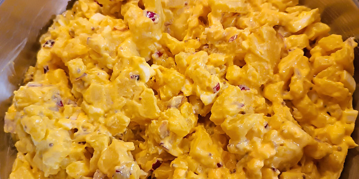 brambory typ a, cibule červená, vejce, jogurt bílý, majonéza, křen, hořčice, sůl, cukr krupice, ocet