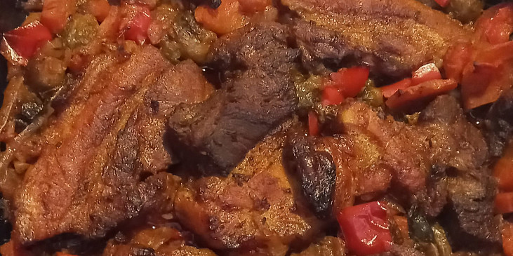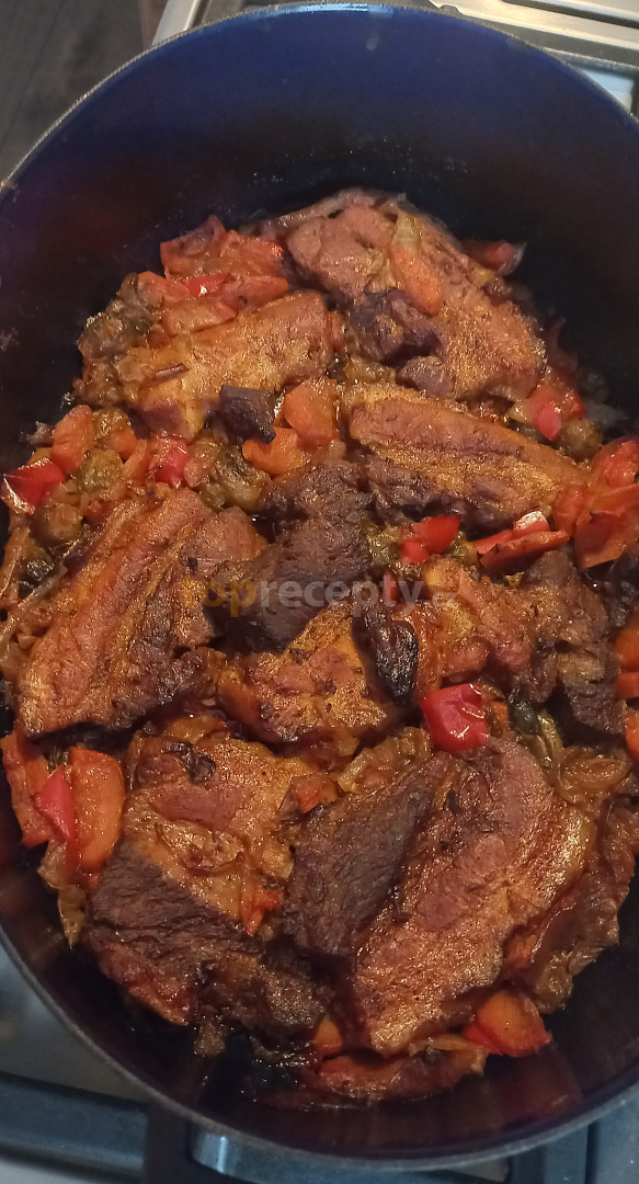 bůček, cibule, cibule červená, mrkev, kapusta, kapie, paprika sušená sladká, sůl, kmín drcený, česnek sušený, pivo černé